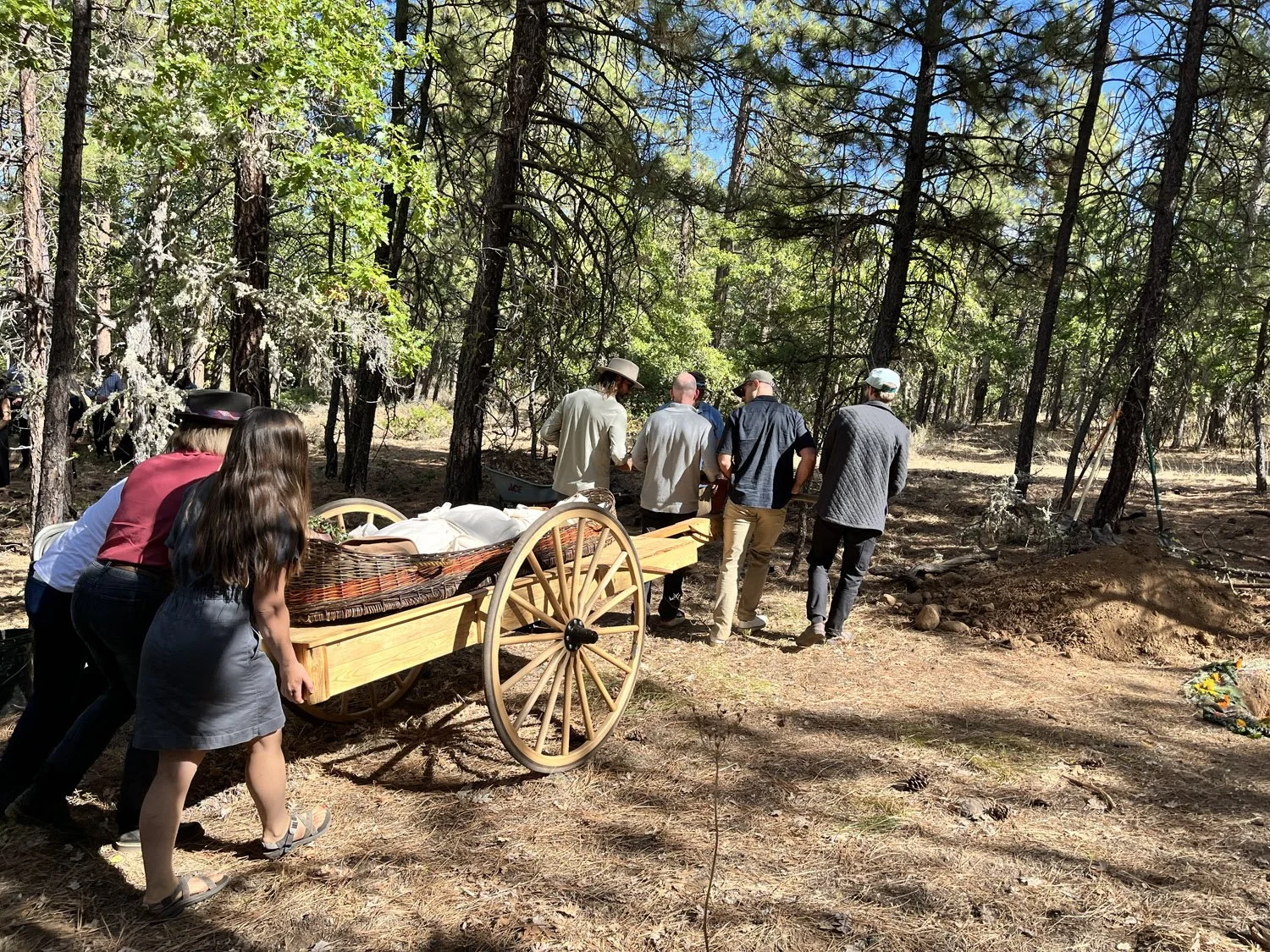 Once guests arrive, we support you step by step - we invite you to help engage with each aspect of a burial if you would like to - if not, we are here to help. We greet guests in the Ekone Valley and caravan (or hike) the final half-mile up to the White Eagle parking area, then we move the shroud or casket from the funeral director’s vehicle or a private vehicle onto our wheeled cart, and walk out together through the forest to reach the grave site.